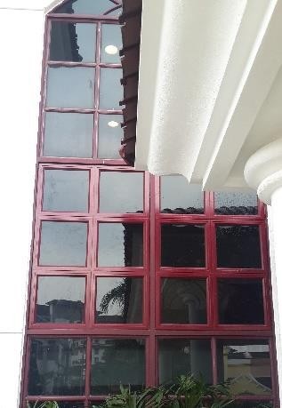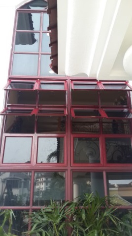 Product: Top hung window with powder coated maroon finish & 6 mm dark tinted glass.